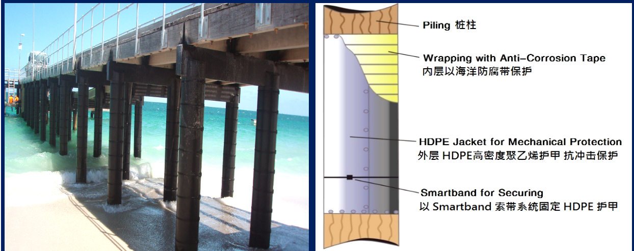 礦脂防腐帶可以在水中施工,海(hǎi)洋級礦(kuàng)脂防腐帶纏繞在碼頭鋼樁外,對鋼樁(zhuāng)的(de)潮汐區和飛濺區實現長久保(bǎo)護(hù),配合防腐帶底漆(qī)和(hé)HDPE護甲,防腐周期長達(dá)20年以上。