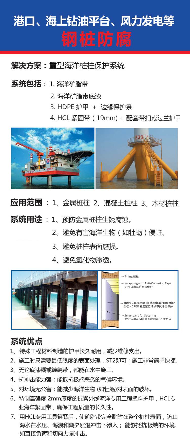 礦脂防腐帶可以在水(shuǐ)中施工(gōng),海(hǎi)洋級礦脂防腐帶(dài)纏繞在碼頭鋼樁外,對(duì)鋼樁的潮汐區和飛濺區實現長久保護,配合防腐帶底漆和HDPE護甲,防腐(fǔ)周期長達20年以上。