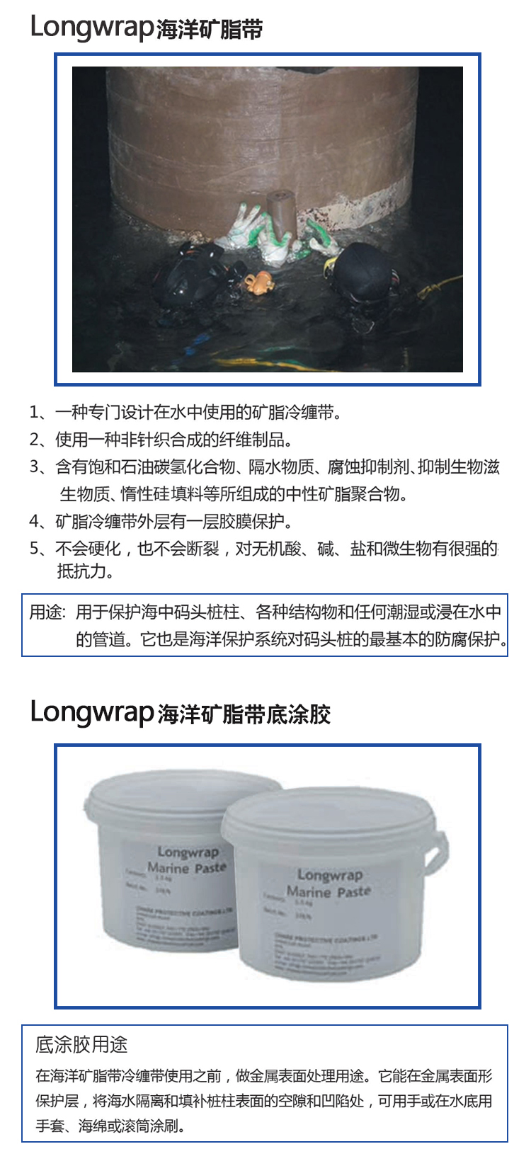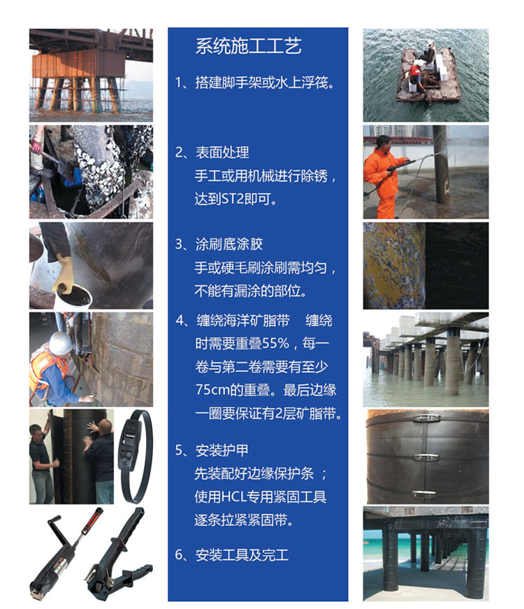 礦脂防腐帶冷纏係統保護(hù)防腐帶底漆、海洋級礦脂防腐帶、護甲層和緊(jǐn)固係(xì)統。保(bǎo)護區域從低水位往下50cm到飛濺區。對鋼(gāng)樁易腐蝕部位進行長(zhǎng)久防腐(fǔ),一勞永逸。
